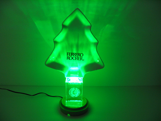 怎么办?我又联想到了彩色灯艺(不打广告不行了,为了环保,请看官谅解),如果用彩灯装扮一下,作为一件圣诞灯艺摆设,应该不错,那就试试吧。如果效果好,就给有需要又愿意动手的人参考,节约一点是一点。 说干就干,利用BL8发光套件作为底座灯,不出半个小时,做好了,用烟灰缸做的发光底座,找一个水晶工艺品(不用也行),凑在一起,如图,通上电发光,自我感觉挺好,尤其是盘子的凹凸,在灯光的作用下具有了“模棱图”的效果。