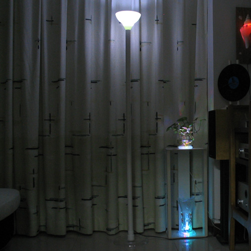 利用最后一节塑料水管,一个摩托罗拉手机充电器,一个闲置的糖果盘,自己做的发光二极管发光板,做成了一个落地灯,作为看电视、聆听音乐时的背景光,给大家参考。