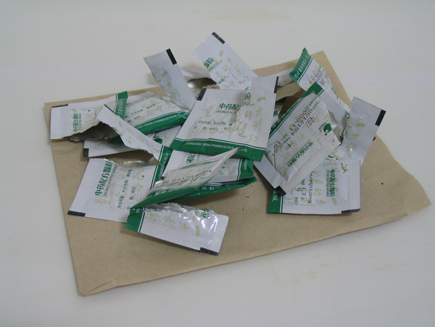 这又是一个为了一点点方便而不顾环保,中药包装,这小袋子还不仅仅是塑料,里面还有一层铝箔之类的东西,很难降解和回收处理。记得电视中报道过有人花了数年时间和用尽了家财,有了可批量化处理的办法,可是分散到各地的这东西,如何回收啊!