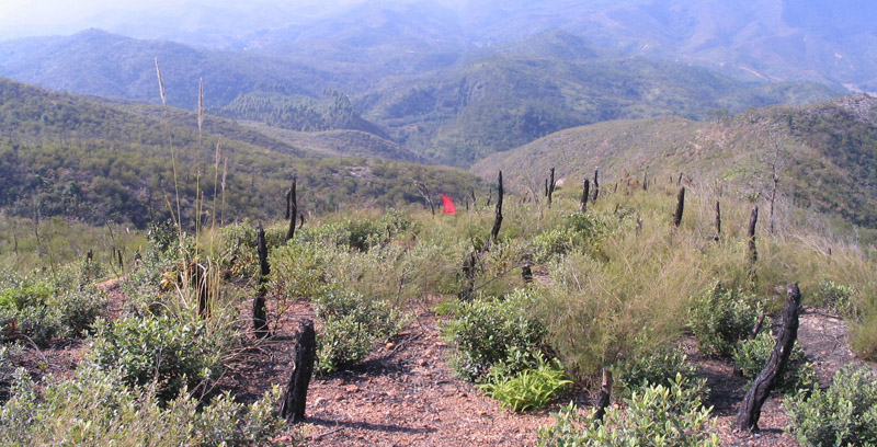 说着,来到了山脚下,举目望去,整片的山都给烧光啦,看小灌木和新生的小树,这情景,应该烧了有两年了。