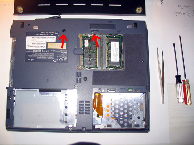 首先,把电脑背后的电池、硬盘、内存、DVD先拆卸下来。这些边看边琢磨,网上有很多介绍,在此就不细说了。
