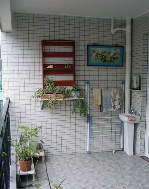 底下一层是在长3米的遮盖空调的框架上铺满了客厅大瓷砖(80x80)边角料和一块捡来的人家扔了的整块80x80的瓷砖。