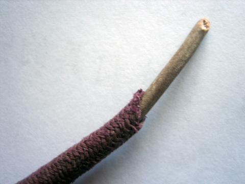 在适当位置打一个结,以防使用中拖拉而影响导线连接之可靠性。提示:要先将导线穿入那个红色的护套中,在打结。剥出适当长度线头。
