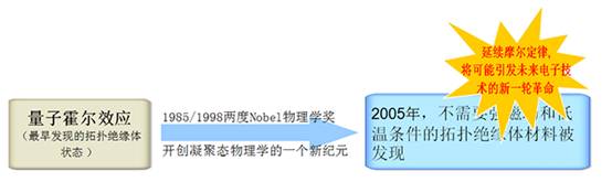 最早发现的拓扑绝缘体状态,可以追溯到20多年前发现的量子霍尔效应。量子霍尔效应分别获得1985年和1998年两度Nobel物理学奖,开创了凝聚态物理学的一个新纪元。但由于这种效应需要满足强磁场和低温这两个条件,不利于推广应用。直到2005年,人们才发现不需要强磁场和低温条件,仅仅依靠任何材料都具有的自旋轨道耦合效应,就可以实现类似于量子霍尔效应中的电子态,即量子自旋霍尔效应态或拓扑绝缘体态。这立刻引起了全球科学家界的重大关注。摩尔定律认为,由于技术的进步,每过18个月,集成电路上可容纳的晶体管的数目会翻一番,性能也将提高一倍。随着晶体管越小越密集,发热问题也就会越突出,因此许多人预言摩尔定律将于2015年失效。而拓扑绝缘体的发现将可能解决这个问题,从而引发未来电子技术的新一轮革命。2006年,美国斯坦福大学的科学家提出,在碲化汞量子阱体系中可能存在无需磁场而由本征材料能带结构产生的拓扑绝缘态,而这种特殊的拓扑绝缘体态将引起非常有趣的“量子自旋霍尔效应”,该效应入选科学评出的2007年十大科学突破并列第二位。
