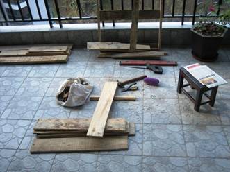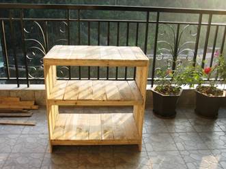 2. 然后将较宽的木板条拼成平面板,铺装在木框上面,制作成储物架的横格板;