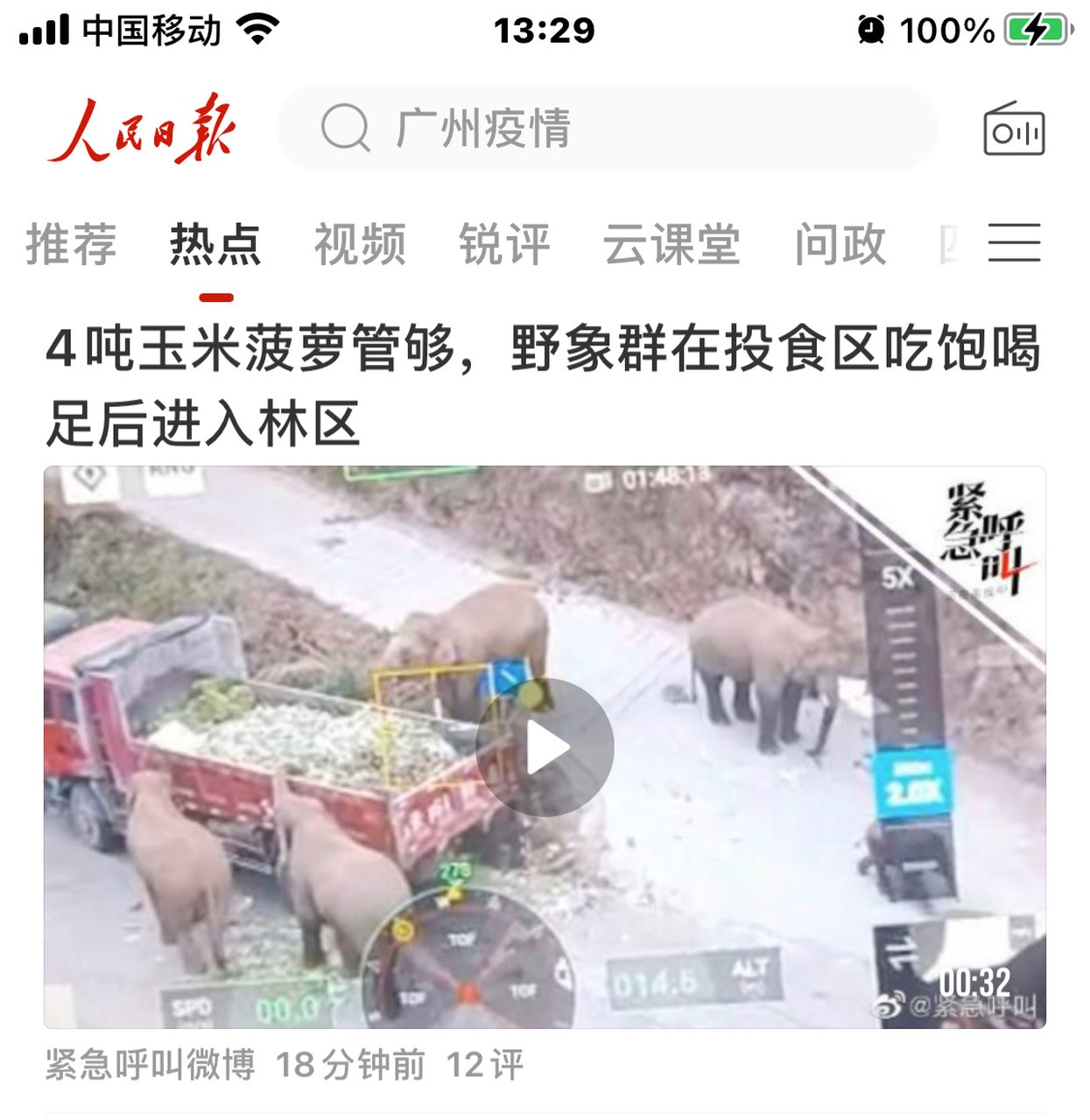 人民日报报道《象群距昆明晋宁区直线距离仅300米,有继续北迁趋势》昆明日报微博2021-06-02 21:24