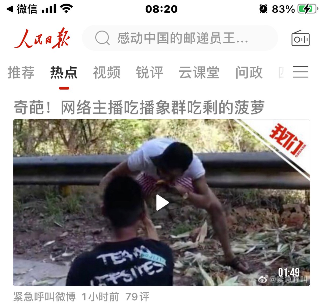 人民日报报道《奇葩!网络主播吃播象群吃剩的菠萝》