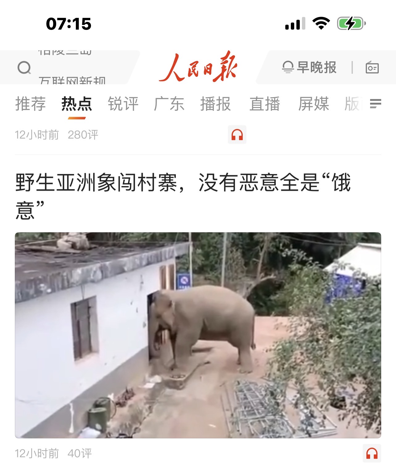 人民日报报道《云南15头野象继续北迁,直升飞机渣土车追踪堵截》