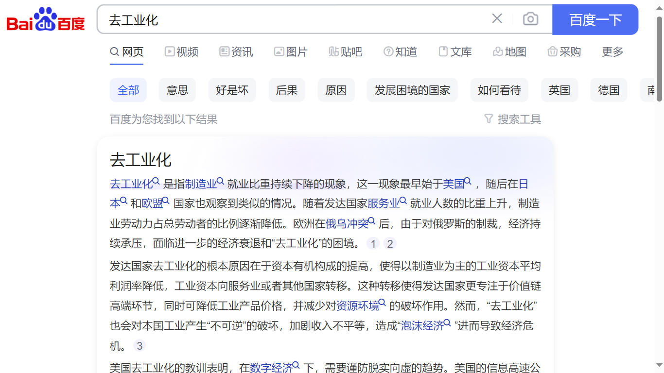 百度搜索“去工业化”,显然并不容易,成要180年,去能不要180年吗?