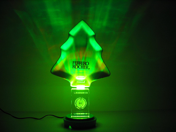 说干就干,利用BL8发光套件作为底座灯,不出半个小时,做好了,用烟灰缸做的发光底座,找一个水晶工艺品(不用也行),凑在一起,如图,通上电发光,自我感觉挺好,尤其是盘子的凹凸,在灯光的作用下具有了“模棱图”的效果。